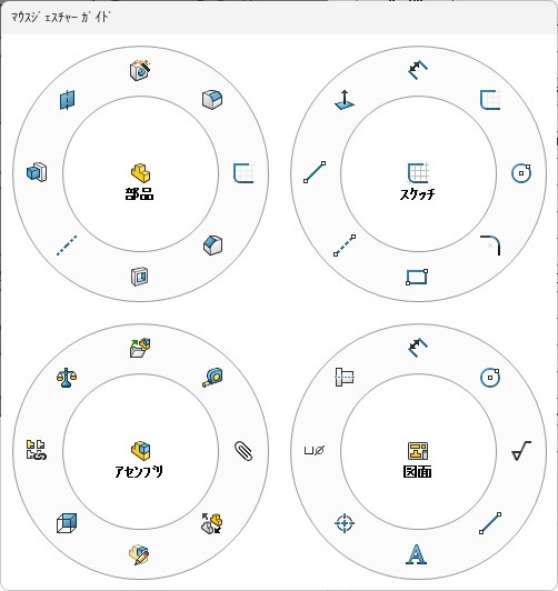 設定は8方向まで登録可能。モード(部品・スケッチ・図面)ごとに別々のコマンドを割り当てられます。